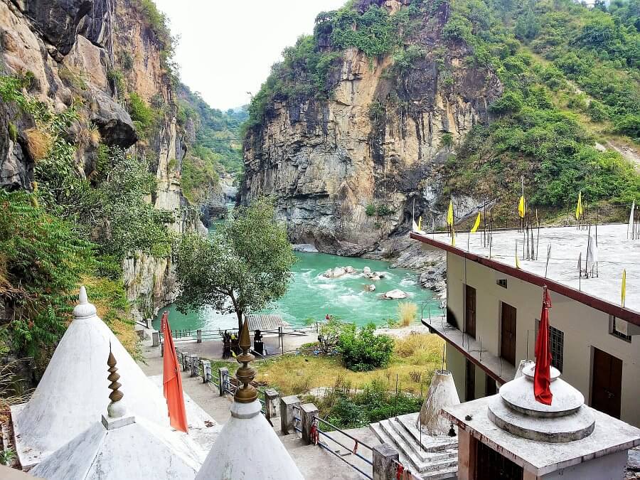 2 km distance. Right above the river confluence. According to mythology it is here that Lord Rudra (Siva) taught music to the sage Narada. All worship in this temple is done by female priests.